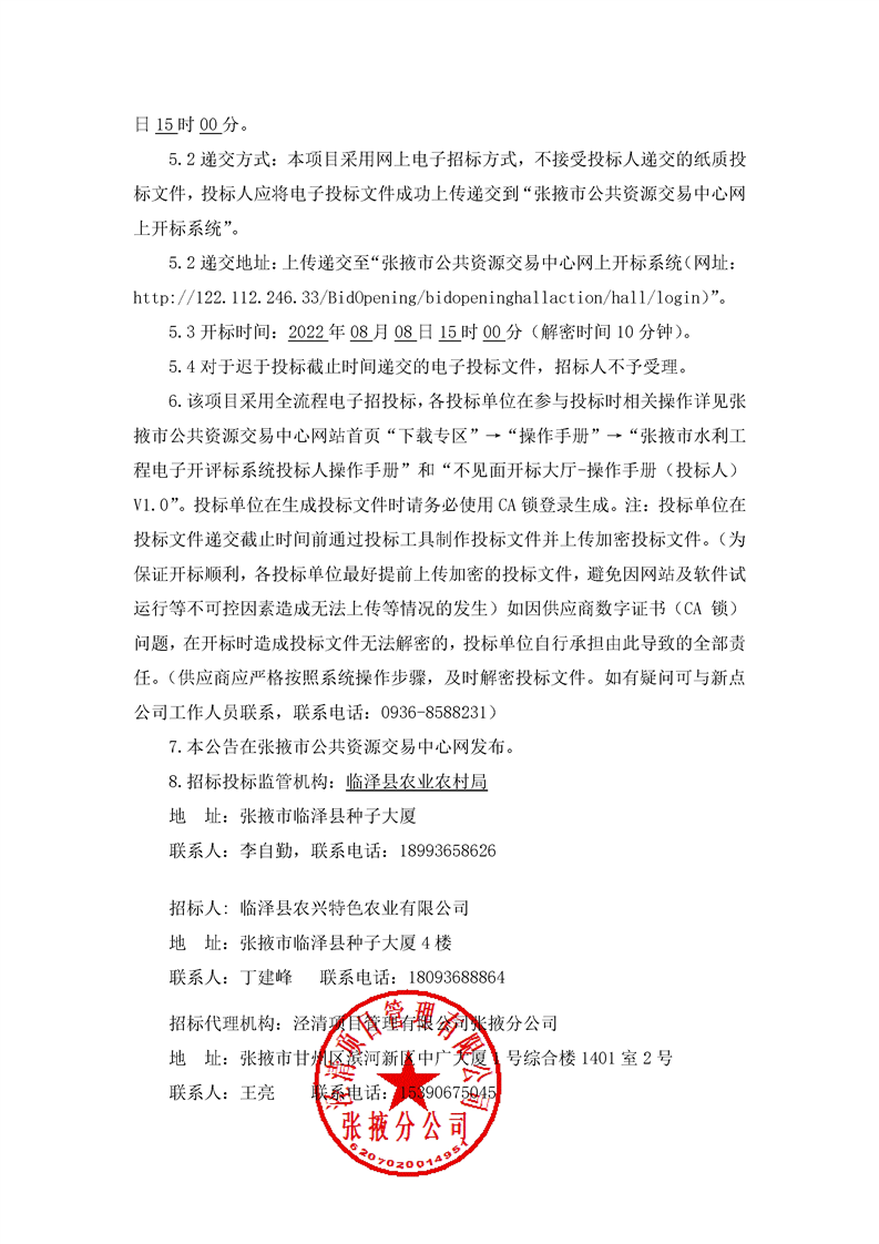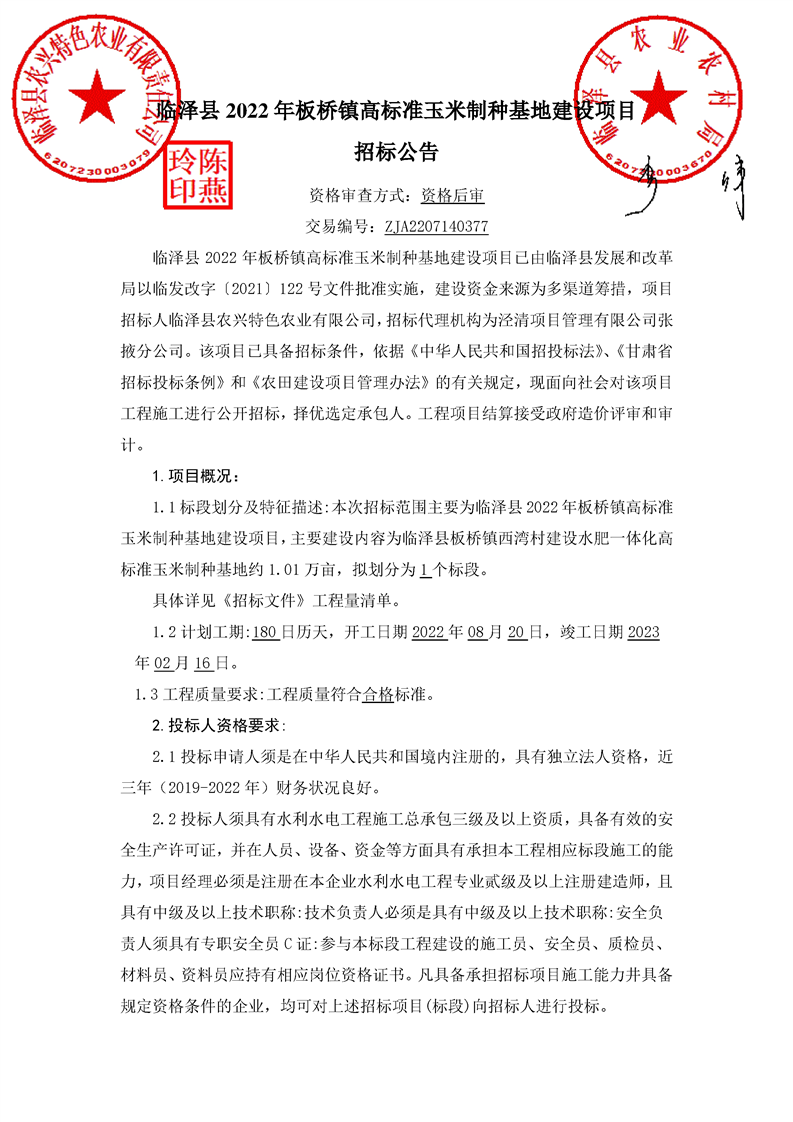 临泽县2022年板桥镇高标准玉米制种基地建设项目招标公告