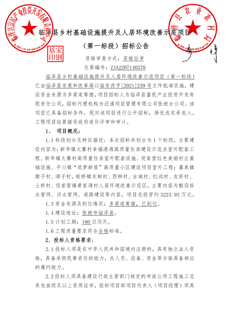 临泽县乡村基础设施提升及人居环境改善示范项目(第一标段)招标公告