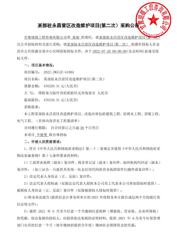 某部驻永昌营区改造维护项目(第二次)采购公告