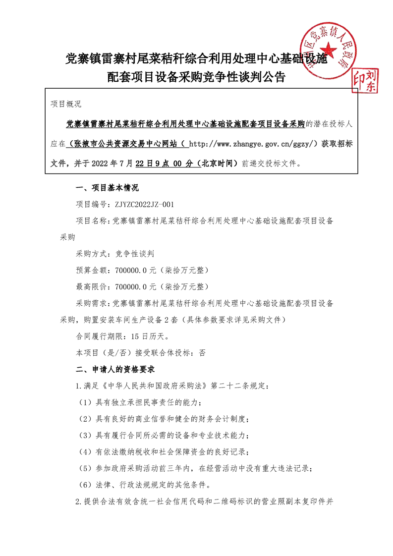 党寨镇雷寨村尾菜秸秆综合利用处理中心基础设施配套项目设备采购