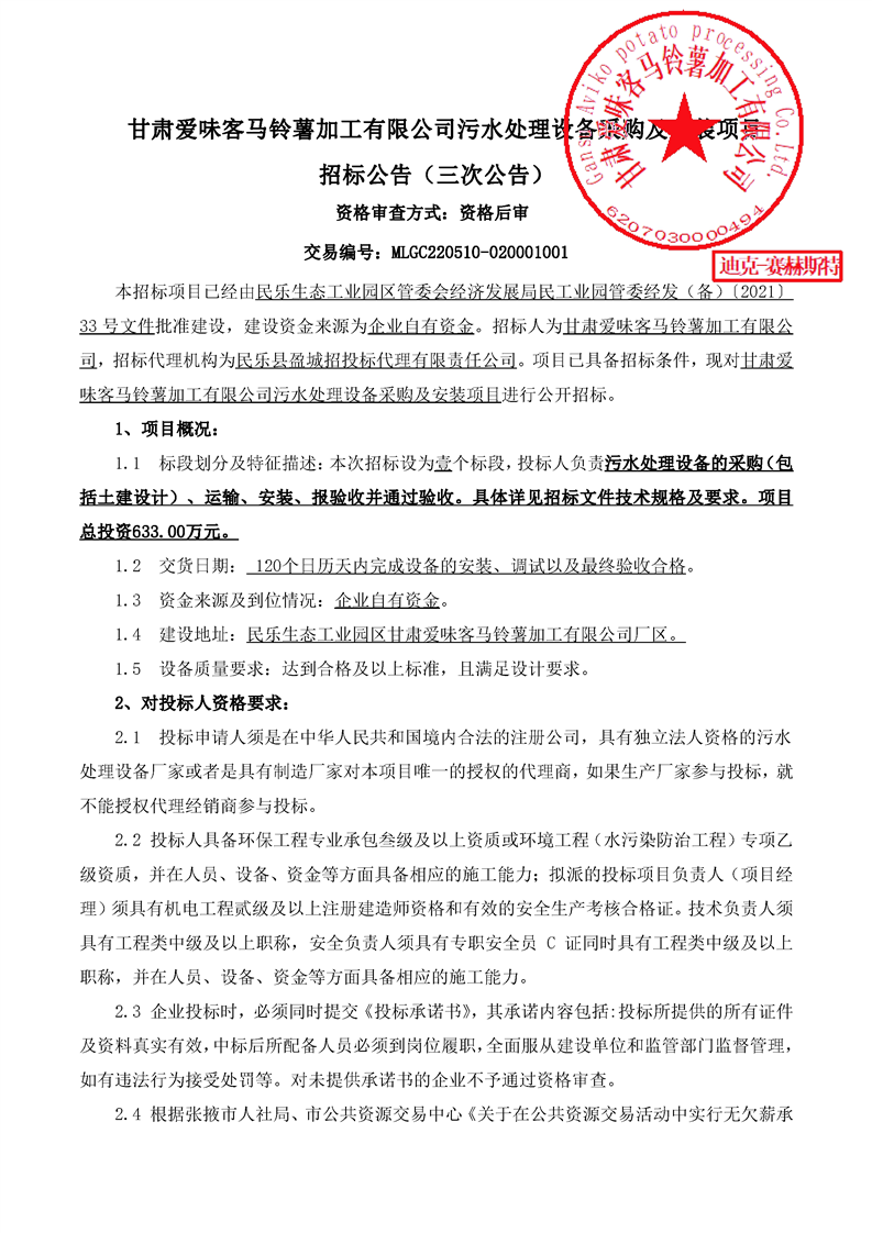 甘肃爱味客马铃薯加工有限公司污水处理设备采购及安装项目招标公告(三次公告)