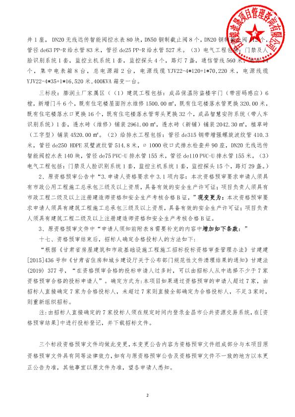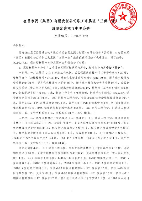 金昌水泥(集团)有限责任公司职工家属区“三供一业” 维修改造项目变更公告
