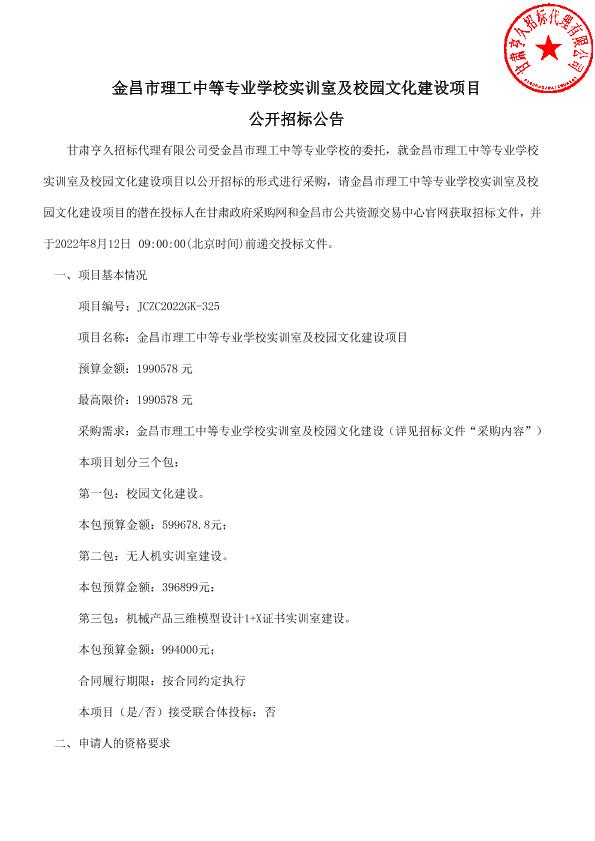 金昌市理工中等专业学校实训室及校园文化建设项目公开招标公告