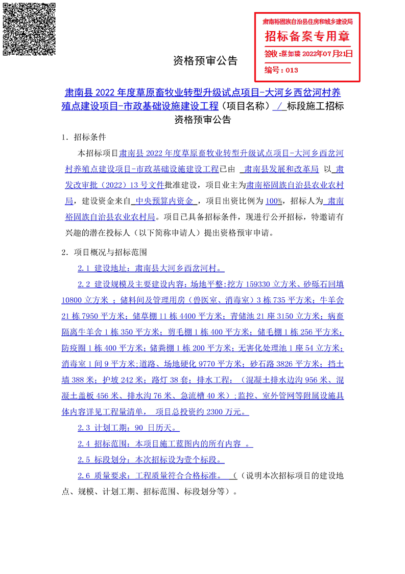 肃南县2022年度草原畜牧业转型升级试点项目-大河乡西岔河村养殖点建设项目-市政基础设施建设工程